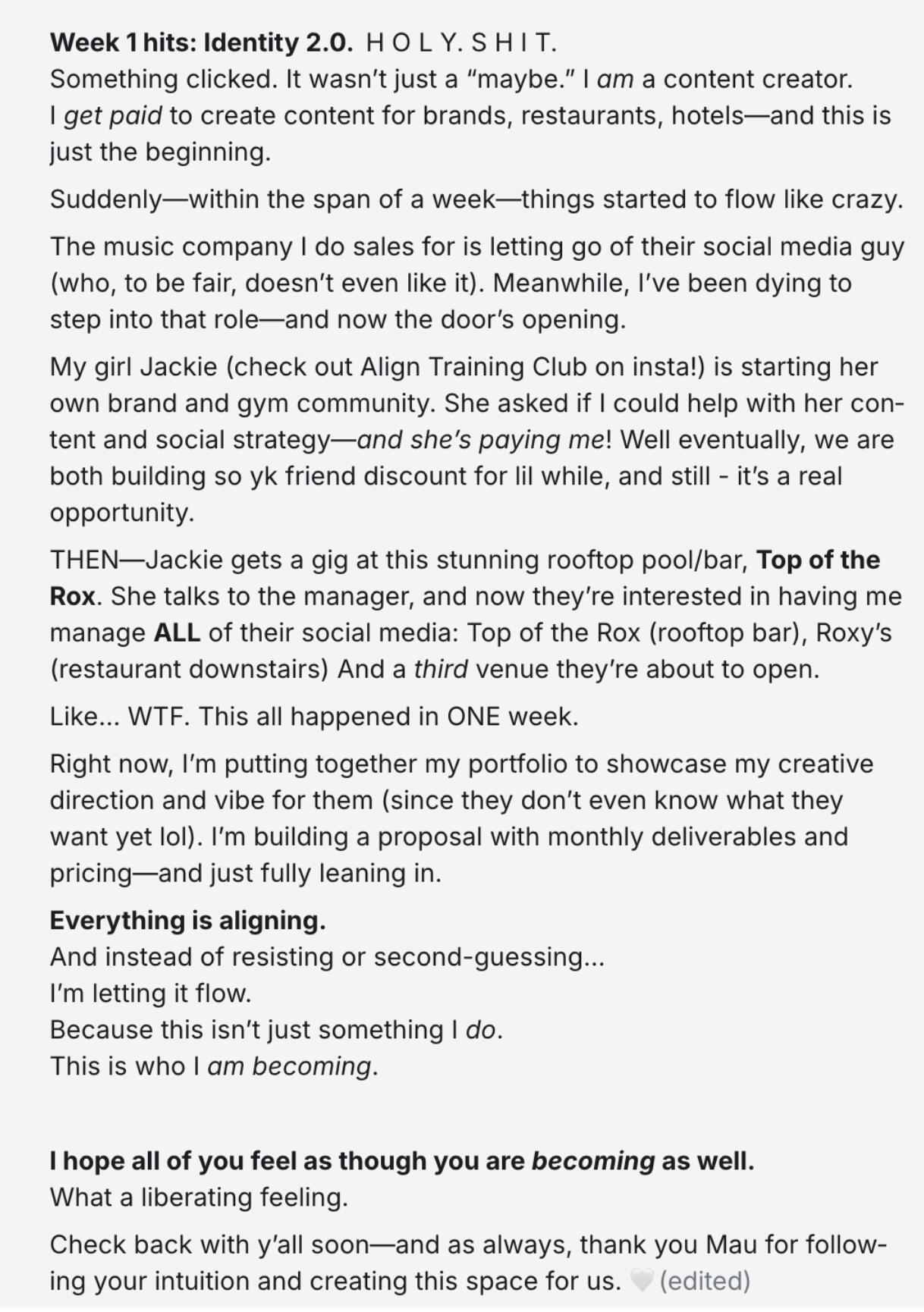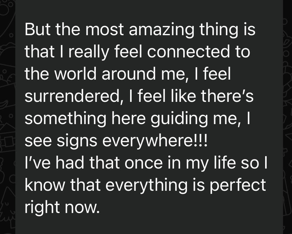 I left everything behind in Austin, cut everything that wasn’t aligned, and went all in on building a business by being myself.I used the exact same principles I share inside Step Into Flow to:• Get clarity on who you are/what you’re here to do• Remove the blocks holding you back• Learn to flow with life — not against it — so the life you want begins to effortlessly create itselfI’m not where I want to be yet…but I’m living proof that this works.And now — so are they: